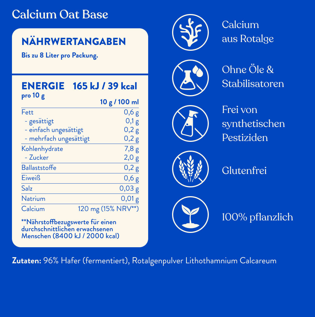 Bei der Herstellung der Oat Base wird der Hafer enzymatisch behandelt, um die natürliche Süße und cremige Textur zu erzeugen, wenn er in Wasser aufgelöst wird. So können wir auf unnötige Bindemittel und Zusatzstoffe verzichten, die in vielen fertigen Haferdrinks enthalten sind. Anschließend wird die Oat Base mit Bio-Rotalgenpulver angereichert, um sie mit natürlichem Calcium zu versorgen.
